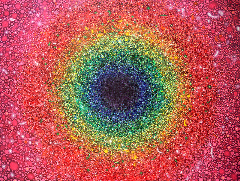 No portraits, no nudes, barely a few of Lago’s signature happy faces and smiley hearts… this time at Maxima Gallery, color is the absolute protagonist. We had a first hint of this occurrence two years ago at Lloyd’s Register, when Lago introduced the rainbow leitmotiv. A few related paintings are included in The great awakening but presently the rainbow motif is taken further: beyond the scale of the optical phenomenon we’re familiar with, to reach the formidable magnitude of galaxies and the microscopic dimension of cells. As a consequence, the exhibition acquires metaphysical overtones, portraying the rainbow not only as ubiquitous (as it exists in potentiality wherever light reaches, even if it seldom manifests to our eyes) but also as an encompassing energy sustaining Creation.