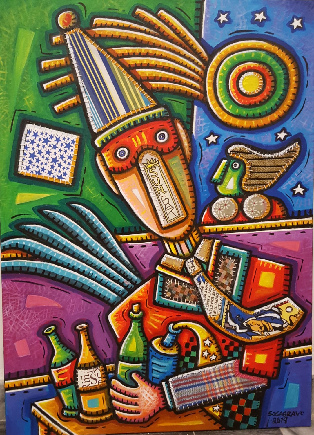 The power of his works lies in the joy they transmit, in their empathic charge and in their ability to interact as if we have always known them. Sosabravo enters into the eyes of others like a symphony of colors that has no end. Characters come and go, there is music, games, plants, exotic figures in landscapes capable of taking us out of the obstinate routine.