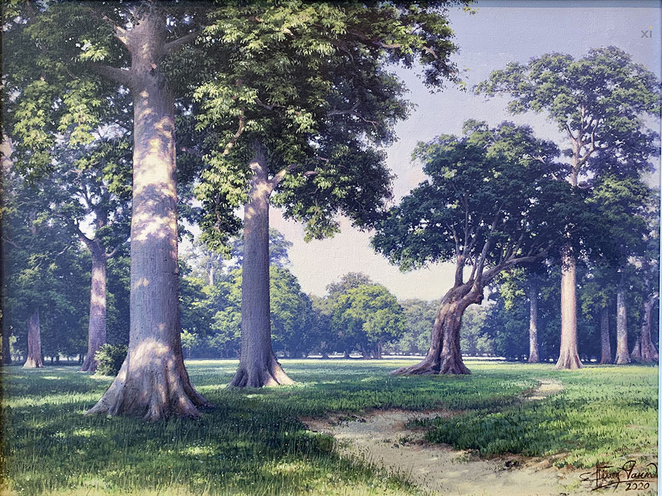 Ernesto Estévez ha escogido el paisaje como escenario casi único en su figuración. De él hemos visto la maravilla transformarse en ríos, lunas, hojas y bosques con un alto grado de precisión y detalle.