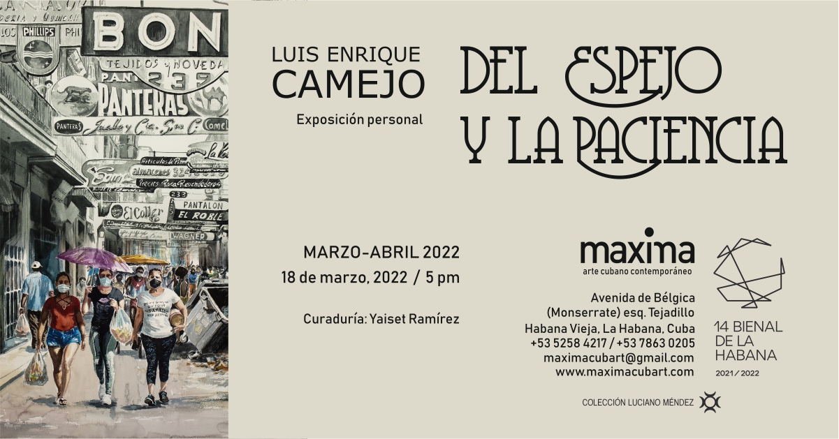 La primera exposición personal de Luis Enrique Camejo en Máxima “Del Espejo y la Paciencia” tendrá su inauguración el próximo viernes 18 de marzo a las 5:00 p.m. con la curaduría de Yaiset Ramírez, directora del espacio.